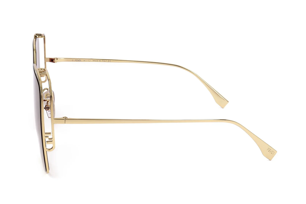 Gafas de sol Fendi FE40038U en metal dorado brillante con lentes solidas color rosa. La colección de gafas de sol de Maison Fendi combina refinamiento y estilo de forma exquisita, en unas gafas aptas también para las personas más exigentes, amantes del lujo y la calidad. La colección de gafas Fendi cuenta con una notable gama de estilos y diseños, que se adaptan a diferentes gustos y preferencias. Desde las clásicas gafas de aviador hasta las audaces monturas de gran tamaño: Maison Fendi tiene algo especial incluso para el ojo más exigente. Cada diseño está elaborado meticulosamente con la máxima atención al detalle, utilizando materiales de primera calidad, para brindar no solo elegancia, sino también comodidad y durabilidad.